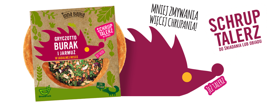 Inna Bajka i BreadPack przedstawiają Bajeczny Duet! Twoje ulubione dania zapakowane do smakowitych, chlebowych, jadalnych misek! Nigdy więcej zmywania, nigdy więcej zbędnych śmieci. Dzięki temu nowatorskiemu rozwiązaniu zyskujesz pyszne, zbilansowane, roślinne, pełnowartościowe śniadanie i obiad. Jadalna miseczka to polski produkt marki BreadPack, wytwarzany z troską o naturę i pieczony według autorskiej technologii. Każdy z posiłków dostarczy Ci ważnych składników wpływających na prawidłowe działania organizmu. A wszystko to w prawdziwie eko opakowaniu Zero Waste. Schrup miskę do posiłku.