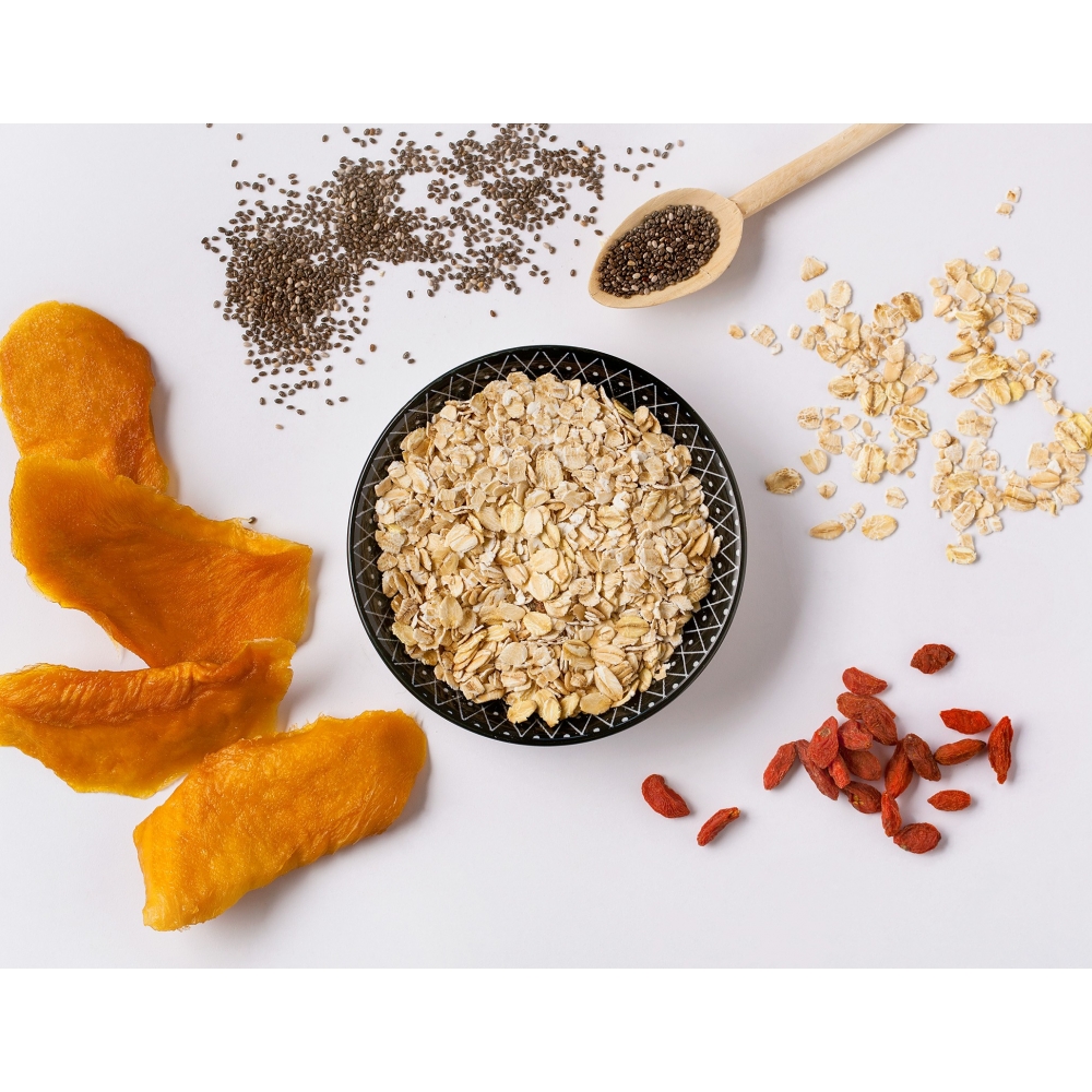 płatki owsiane 61%, mango suszone 15%, jagody goi 12%, nasiona chia, cukier kokosowy, kurkuma