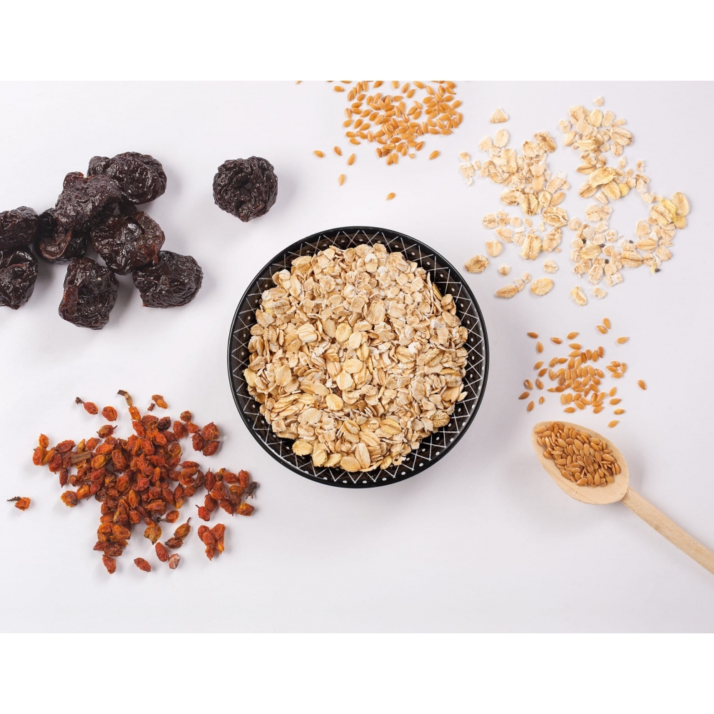 płatki owsiane 50%, śliwka suszona 27%, siemię lniane złote, owoc rokitnika 6%, cukier kokosowy